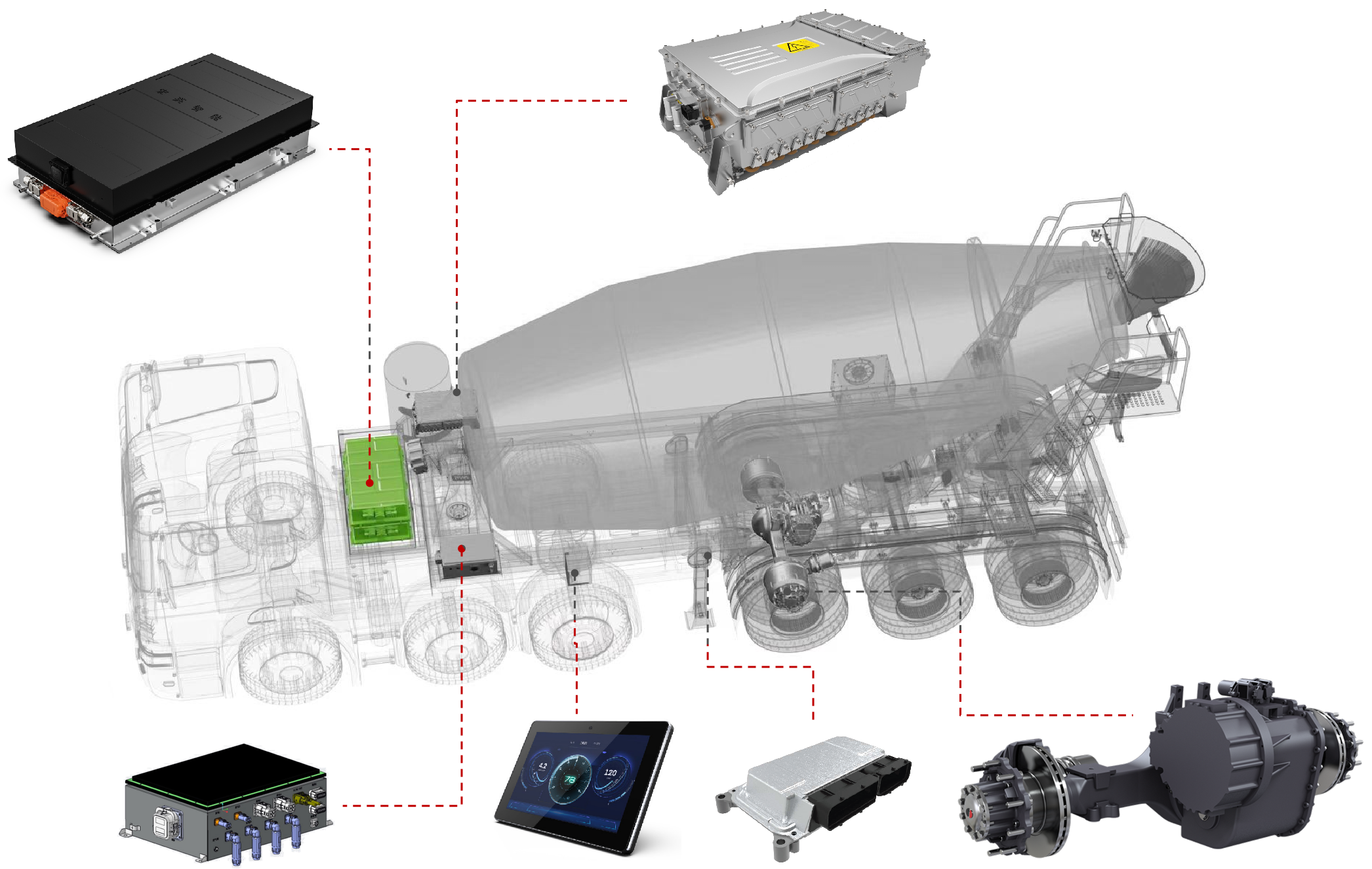 展会上,Z6·尊龙时凯智能的智电一体化解决方案引起了广泛关注。工程师团队在现场为参展观众详细介绍了混合动力牵引搅拌半挂车的系统方案。该方案基于Z6·尊龙时凯智能历经多年开发的eMagi智电平台,针对牵引搅拌半挂车进行了定向开发,涵盖以下几个方面: